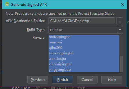 可以选择单个渠道也可以全选,点击Finish,接下来Android Studio就会进行自动多渠道打包