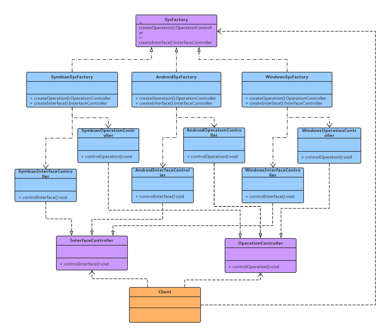 //生产三种不同系统的抽象工厂 public class SymbianSysFactory implements SysFactory { @Override public InterfaceController createInterface() { return new SymbianInterfaceController(); }